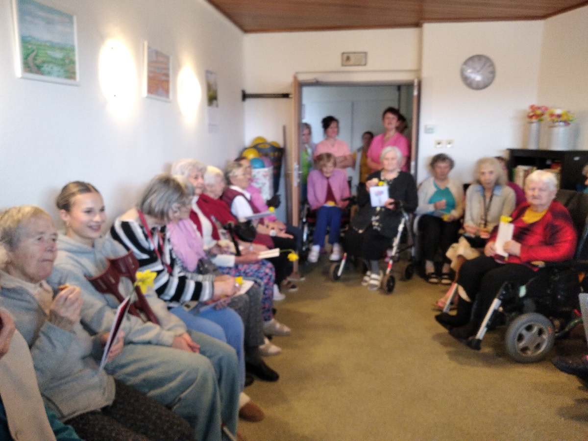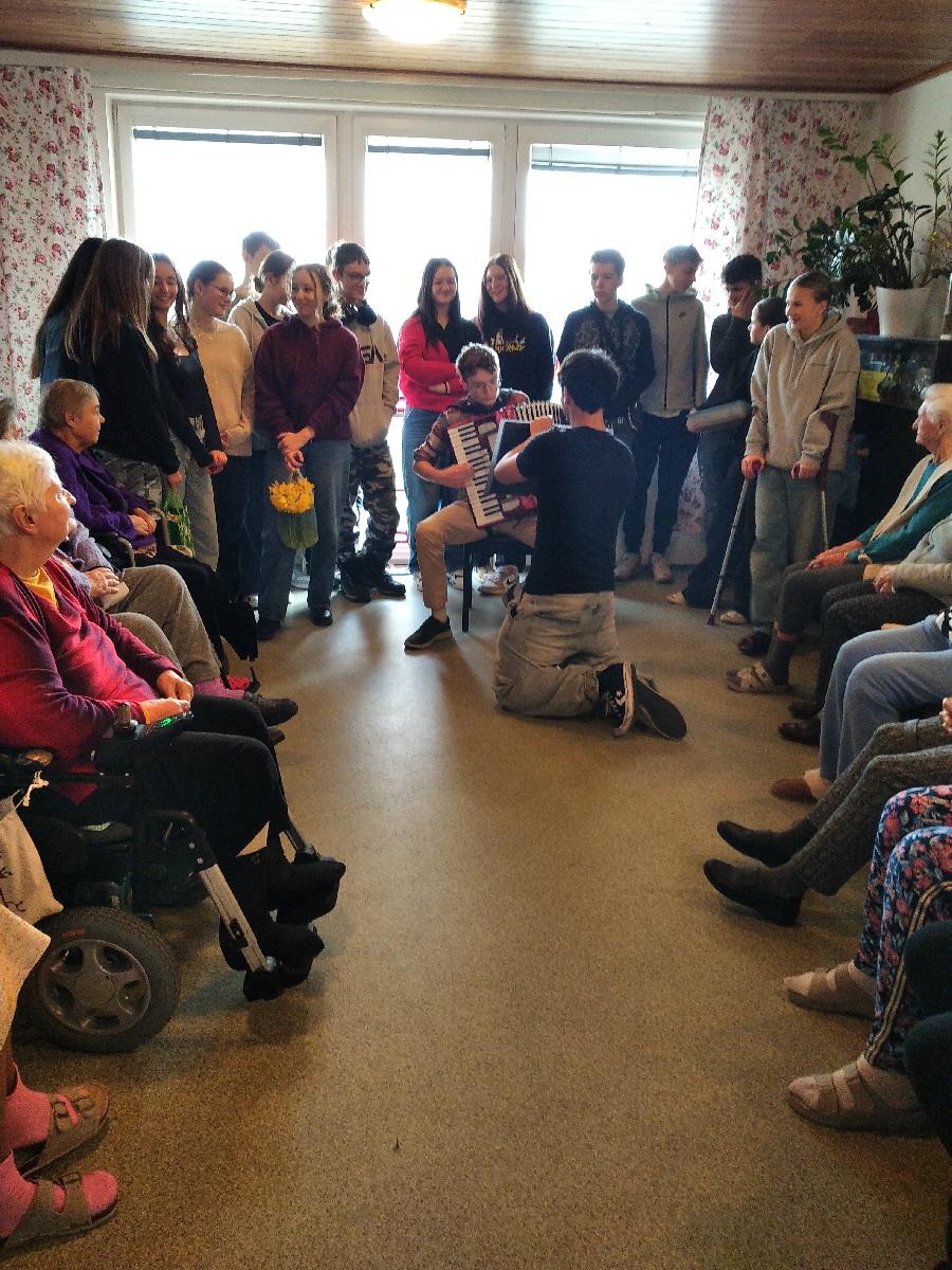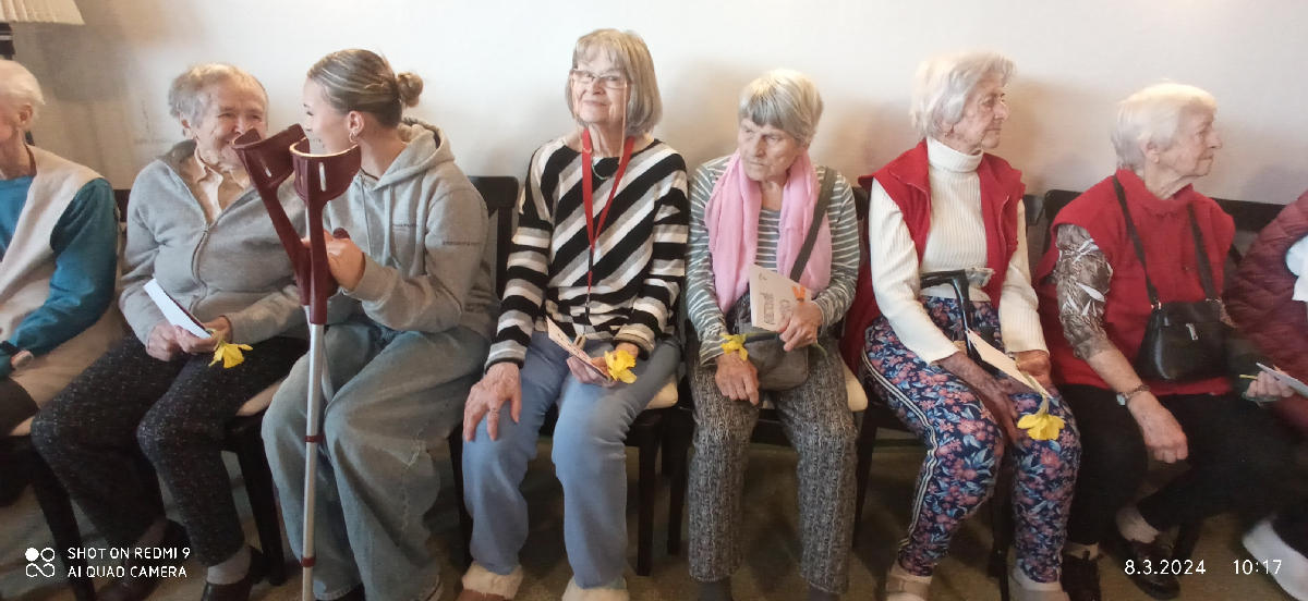 ..... navštívili žáci 9.B naší školy domov důchodců ve Staroměstské ulici, aby popřáli jeho obyvatelkám k Mezinárodnímu dni žen pevné zdraví a radost ze života. Společně si zazpívali při harmonice a předali seniorkám vlastnoručně vyrobená přání, květiny, děvčata dokonce přinesla i doma upečenou bábovku. Po krátkém popovídání se chlapci a děvčata rozloučili. Setkání bylo příjemnou a radostnou událostí pro babičky i děti.