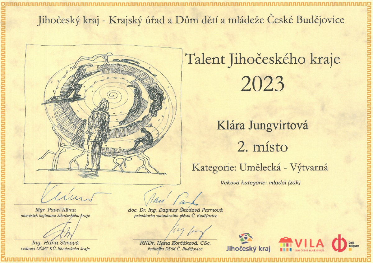 V kategorii umělecko - výtvarné se za rok 2023 umístily velmi úspěšně 2 žákyně naší školy - 1. místo obsadila Lucie Jungvirtová a na krásném 2. místě skončila její sestra Klára Jungvirtová.