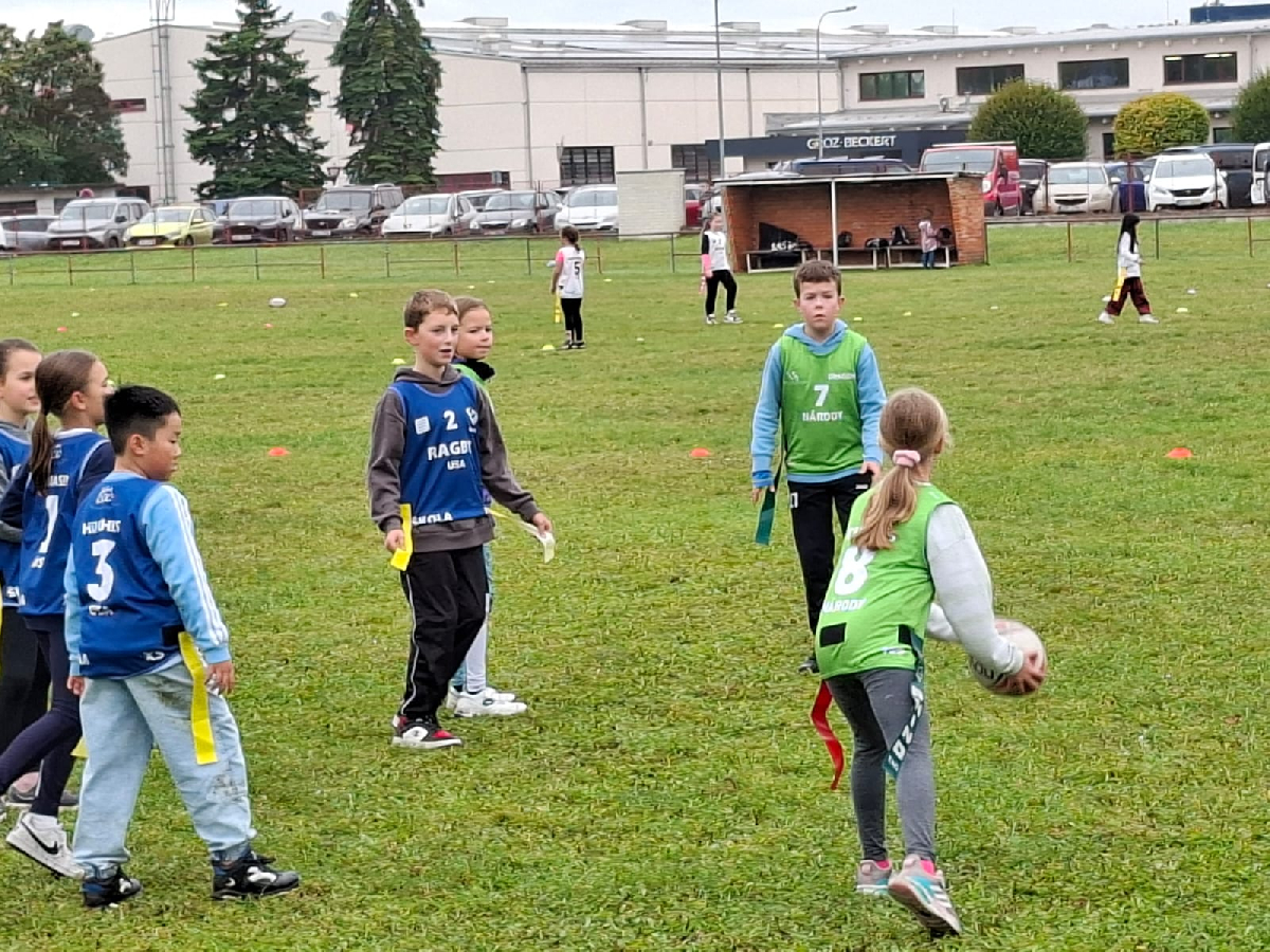 ..... se třídy 4.C a 3.C zúčastnily ukázkového tréninku ragby. Žáci si první hodinu vyzkoušeli průpravná cvičení a druhou hodinu sehráli turnaj mezi jednotlivými týmy.